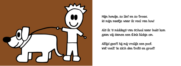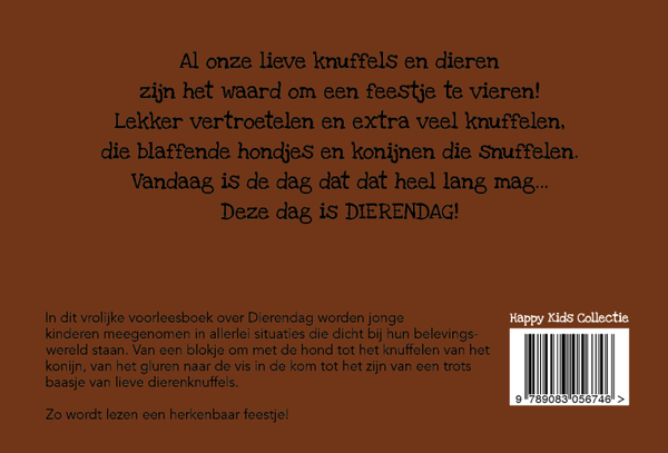 In dit vrolijke voorleesboek over Dierendag worden jonge kinderen meegenomen in allerlei situaties die dicht bij hun belevingswereld staan. Van een blokje om met de hond tot het knuffelen van het konijn, van het gluren naar de vis in de kom tot het zijn van een trots baasje van lieve dierenknuffels.